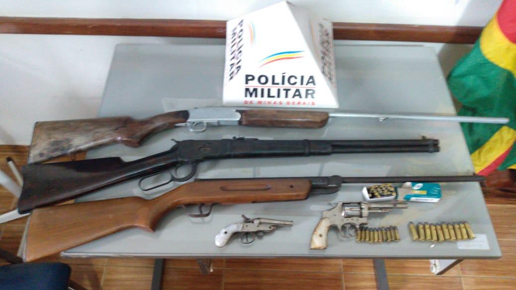 O mandado foi cumprido, inicialmente, na Rua Sete de Setembro, que fica na área central de Guaranésia, onde o autor, E. S. J., de 46 anos, guardava um revólver e uma garrucha, ambos calibre 32, uma espingarda calibre 36, uma carabina 44, cinquenta e duas munições intactas calibre 22 e outras dez nos calibres 44.