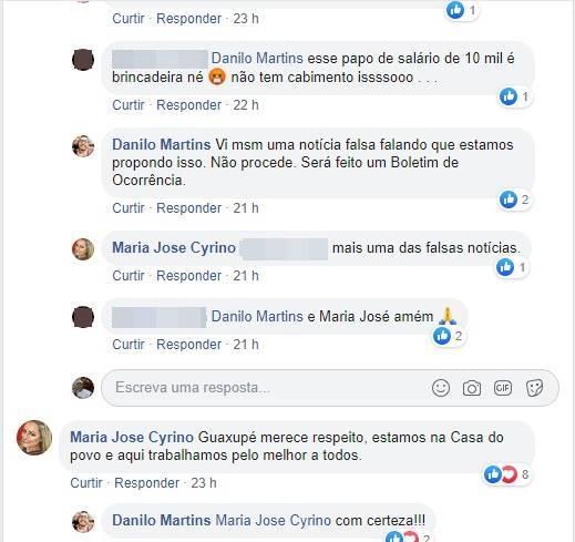 Sobre o reajuste de R$ 10 mil, Danilo foi abordado por uma leitora, em sua página, no Facebook, a qual usou estas palavras: "Esse papo de salário de 10 mil é brincadeira né? Não tem cabimento issssooo...", quando o político em questão afirmou: "Vi msm uma notícia falsa falando que estamos propondo isso. Não procede. Será feito um Boletim de Ocorrência". Com esta declaração, Danilo no mínimo confundiu a cabeça dos cidadãos, haja vista que quem acusou Maria José foi ele, conforme vídeo nesta matéria e disponível também na fanpage da própria Câmara Municipal. Mais do que isto, o vereador afirmou à leitora que suas próprias palavras eram, na verdade, "notícia falsa" e que levaria o conteúdo à polícia, para registro de BO.