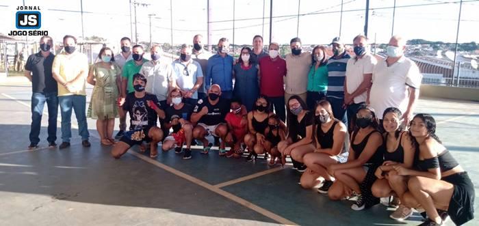 Marcelo Peixão e Aline Monteiro recebem autoridades na quadra da Escola Dr. Carlos, onde funciona o Exército do Bem