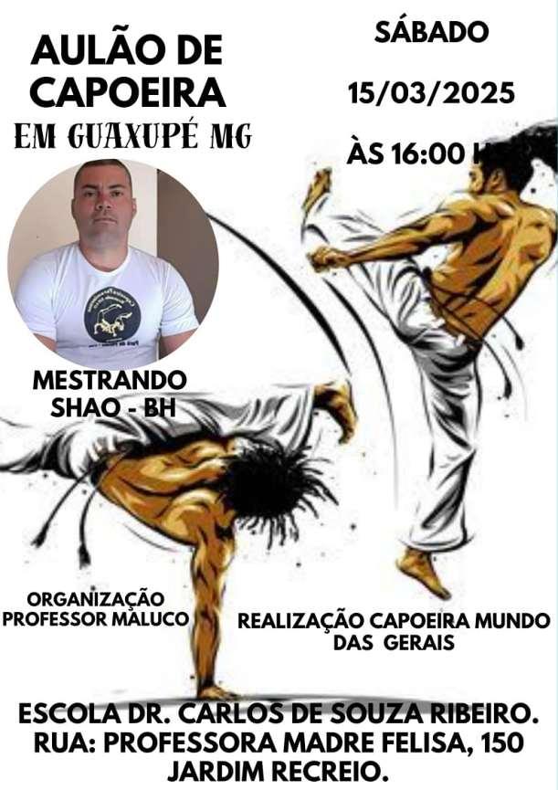O Grupo de Capoeira Mundo das Gerais, de Guaxupé, no Sudoeste mineiro, promoverá, no próximo dia 15, às 16h, um aulão especial da referida arte marcial. A iniciativa ocorrerá na quadra de esportes anexa à Escola Municipal Dr. Carlos de Souza Ribeiro, sob a organização do professor Diney Lopes, o “Maluko”, representante do referido grupo no Município. De entrada franca e aberto a todos os públicos, o encontro contará com a presença do mestrando Alex Shao, da região metropolitana de Belo Horizonte, fundador do “Capoeira Mundo das Gerais”, em parceria com Maluko. Voltado a crianças, adultos e gente da melhor idade, o aulão (do qual todos os grupos de capoeira da cidade e região estão convidados) terá a supervisão do líder comunitário Marcelo Souza de Andrade, o “Peixão”, do Catetos, dirigente do projeto social Exército do Bem, criado há treze anos, em parceria com o Jornal JOGO SÉRIO. - AJUDE O jornal que lhe informa a todos os momentos: faça um PIX de qualquer valor para 11.086.919/0001-66. - CLIQUE AQUI e receba os conteúdos do JOGO SÉRIO em seu whatsapp. - NESSE LINK, você passa a seguir a nova fanpage/facebook Jornal JOGO SÉRIO. - A QUALQUER instante, acesse www.jornaljogoserio.com.br e fique muito bem informado.