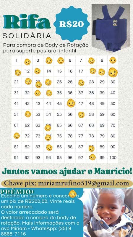 A família do pequeno Maurício, portador de necessidades especiais, que mora em Guaxupé, no Sudoeste mineiro, iniciou, por esses dias, uma campanha social, com vistas à aquisição de um body de rotação para o menino. Impedido de se locomover, ele depende do referido equipamento, que vale R$ 1.630,00, para auxiliar em sua correção postural (e que não é custeado pelo Sistema Único de Saúde). Cientes dos benefícios que o aparelho ortopédico em questão poderá proporcionar à vida da criança, os entes queridos começaram uma rifa, cuja premiação será um PIX de R$ 200,00. Cada número vale R$ 20,00 e as pessoas interessadas em auxiliar em mais essa causa nobre devem contatar a avó de Maurício, dona Míriam Rufino, por meio do telefone whatsapp de número (35) 9-8868-7116. Já para quem deseja ajudar com a doação em dinheiro, a chave PIX é miriamrufino519@gmail.com.