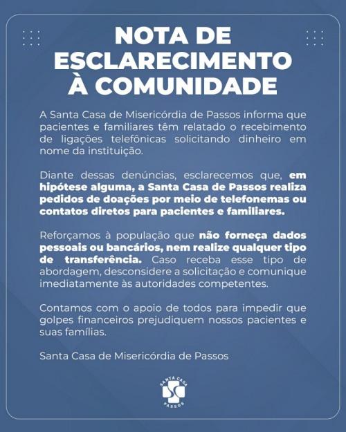 A Santa Casa de Misericórdia de Passos informa que pacientes e familiares têm relatado o recebimento de ligações telefônicas solicitando dinheiro em nome da instituição.