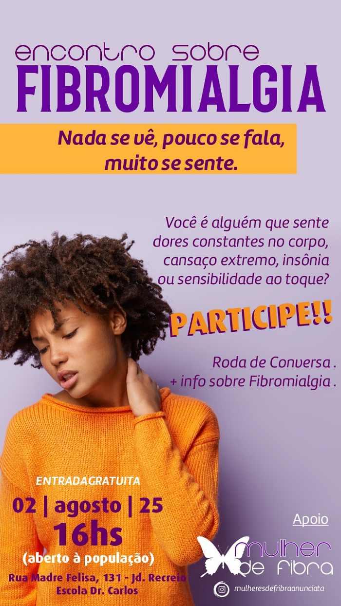 O grupo “Mulheres de Fibra”, fundado pela líder social Tatiane Anunciata, a fim de divulgar temas da fibromialgia, realizará um encontro neste sábado, 2 de agosto, às 16 horas, na sede do Exército do Bem (ONG do Peixão), que fica na quadra poliesportiva anexa à Escola Municipal Dr. Carlos de Souza Ribeiro, em Guaxupé, no Sudoeste mineiro. A ocasião, de acordo com a organização, será composta pela troca de informações a respeito da doença, suas consequências; as conquistas e carências por tratamento de saúde via poder público; entre outras questões. Aberto a todos os públicos, o evento vai ao encontro da filosofia do “Exército...”, parceria de “Mulheres de Fibra”, no sentido de viabilizar promoção humana. - AJUDE O jornal que lhe informa a todos os momentos: faça um PIX de qualquer valor para 11.086.919/0001-66. - CLIQUE AQUI e receba os conteúdos do JOGO SÉRIO em seu whatsapp. - NESSE LINK, você passa a seguir a nova fanpage/facebook Jornal JOGO SÉRIO. - A QUALQUER instante, acesse www.jornaljogoserio.com.br e fique muito bem informado.