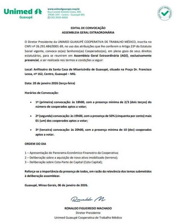 Local: Anfiteatro da Santa Casa de Misericórdia de Guaxupé, situado na Praça Dr. Francisco Lessa, nº 162, Centro, Guaxupé – MG. Data: 20 de janeiro 2026 (terça-feira); Horários de Convocação: 1ª (primeira) convocação: às 18h00, com a presença mínima de 2/3 (dois terços) do número de cooperados aptos a votar; 2ª (segunda) convocação: às 19h00, com a presença de 50% (cinquenta por cento) mais 01 (um) dos cooperados aptos a votar; 3ª (terceira) convocação: às 20h00, com a presença mínima de 10 (dez) cooperados aptos a votar.