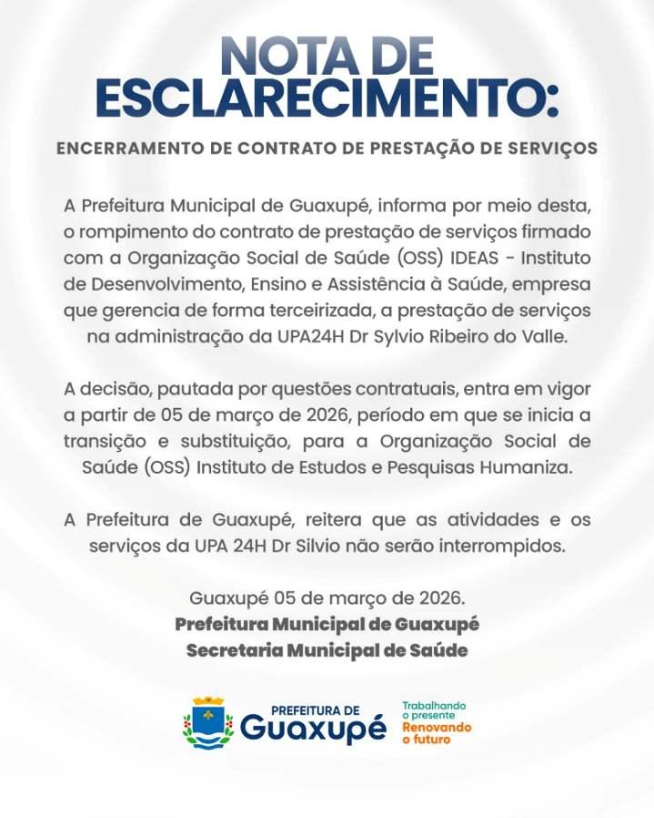 A Prefeitura de Guaxupé, no Sudoeste mineiro, encerrou seu contrato de prestação de serviços com a Organização Social de Saúde IDEAS, que era responsável pela gestão da Unidade de Pronto Atendimento Dr. Sylvio Ribeiro do Valle. Conforme apurado pelo Jornal JOGO SÉRIO, há algum tempo o governo municipal convivia com reclamações e detectava problemas com a empresa em questão.