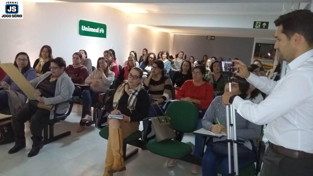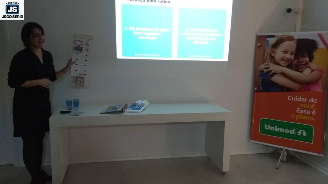 A reunião, conduzida pela assistente social Joice Caselato, coordenadora do "Viver Bem/Unimed Gpe", destacou uma palestra com a psicóloga Luciana Bárbara, especialista em Transtorno do Espectro Autista. Muito didática, ela prestou informações teóricas e práticas ao público-alvo. "Temos, na Unimed, uma preocupação muito grande com o desenvolvimento das crianças, pois sabemos que os pais e a escola somam com os atendimentos que fazemos aqui. A ideia é passar algumas técnicas utilizadas na clínica, que podem ser usadas nas escolas e facilitam o aprendizado destas crianças, que precisam de algo mais específico, direcionado", explicou Luciana.