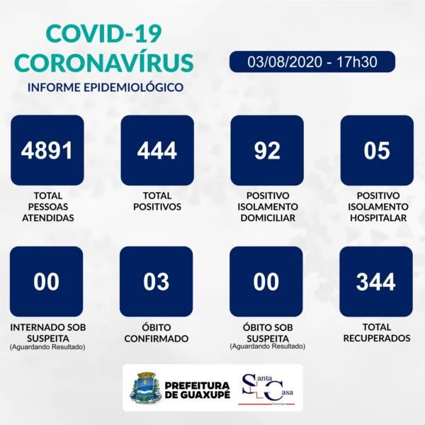 O mais novo Boletim Epidemiológico divulgado há pouco (agora são 17h45 desta segunda-feira, 3 de agosto) pela Secretaria Municipal de Saúde dá conta de mais vinte e quatro vítimas da COVID-19 recuperadas e doze novos casos da doença em Guaxupé. A Santa Casa, conforme o mesmo documento, está com cinco pessoas internadas por conta do Novo Coronavírus, sendo que três pacientes estão na Unidade de Terapia Intensiva e dois em leitos clínicos. Sendo assim, Guaxupé totaliza 444 casos positivos, dos quais 344 já receberam alta médica; 97 encontram-se em isolamentos (5 hospitalares e 92 domiciliares) e 03 óbitos foram confirmados desde o início da pandemia no Município. Dos sete leitos disponíveis na "UTI Covid-19 da Santa Casa GPE", três estão ocupados com pessoas de Guaxupé enfrentando o referido vírus. Veja, na parte de Saúde deste www.jornaljogoserio.com.br, outros artigos sobre o combate ao Novo Coronavírus.