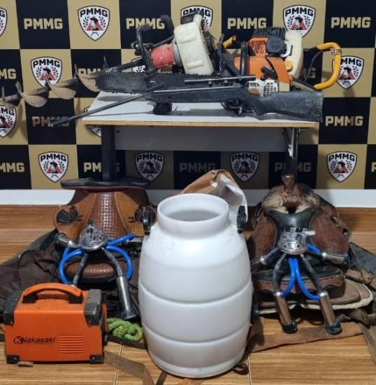 Os PMs foram informados de que o sistema de câmeras da instância havia registrado a presença de suspeitos no local, tendo patrulheiros deslocado até o endereço, onde conseguiram recuperar um kit aranha ordenhadeira, duas selas de cavalo, uma motosserra STIHL, duas motoperfuratriz/perfurador de solo, uma máquina de solda, uma carabina Rossi de "chumbinho", um frasco de óleo lubrificante, borrachas (mangueiras) de ordenha, um vasilhame de ordenha e um frasco de detergente para limpeza de baldes.
