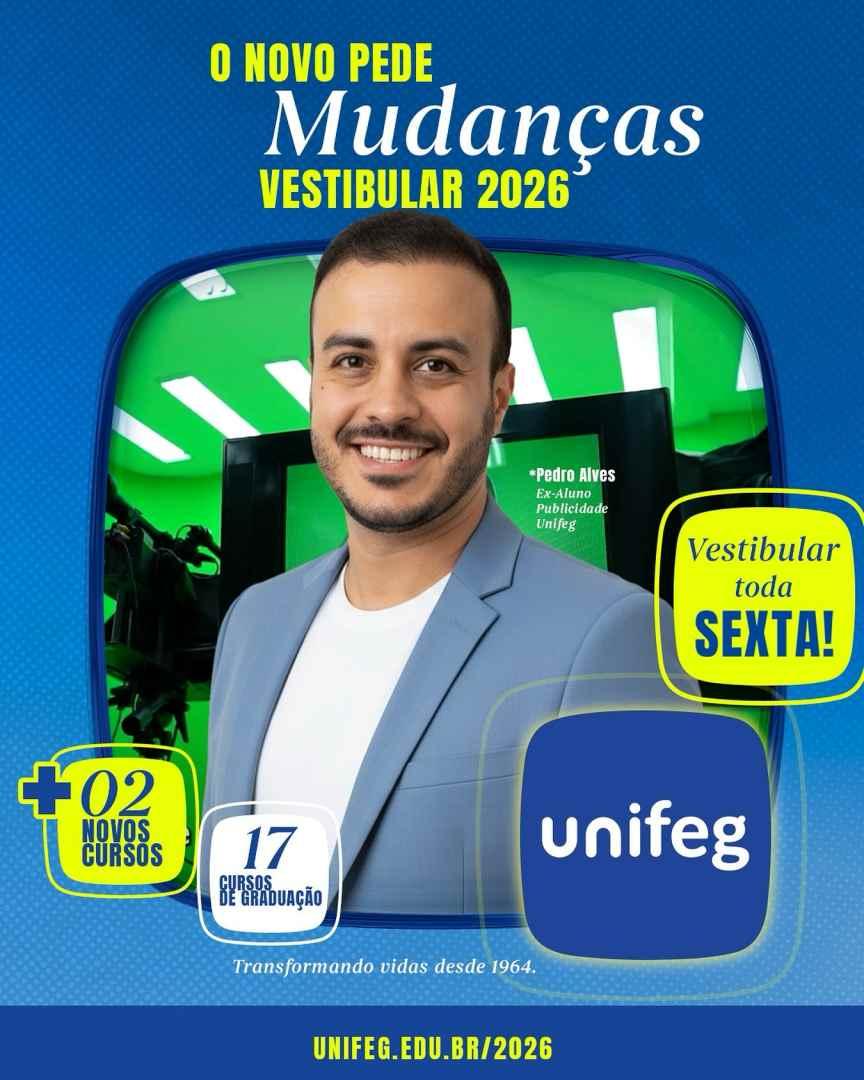 Com 17 cursos de graduação — incluindo duas novas opções — o Unifeg reafirma sua tradição de formar profissionais qualificados desde 1964. Entre as áreas oferecidas estão Educação, Saúde, Negócios, Tecnologia e Comunicação.Os interessados podem se inscrever pelo site unifeg.edu.br/2026.