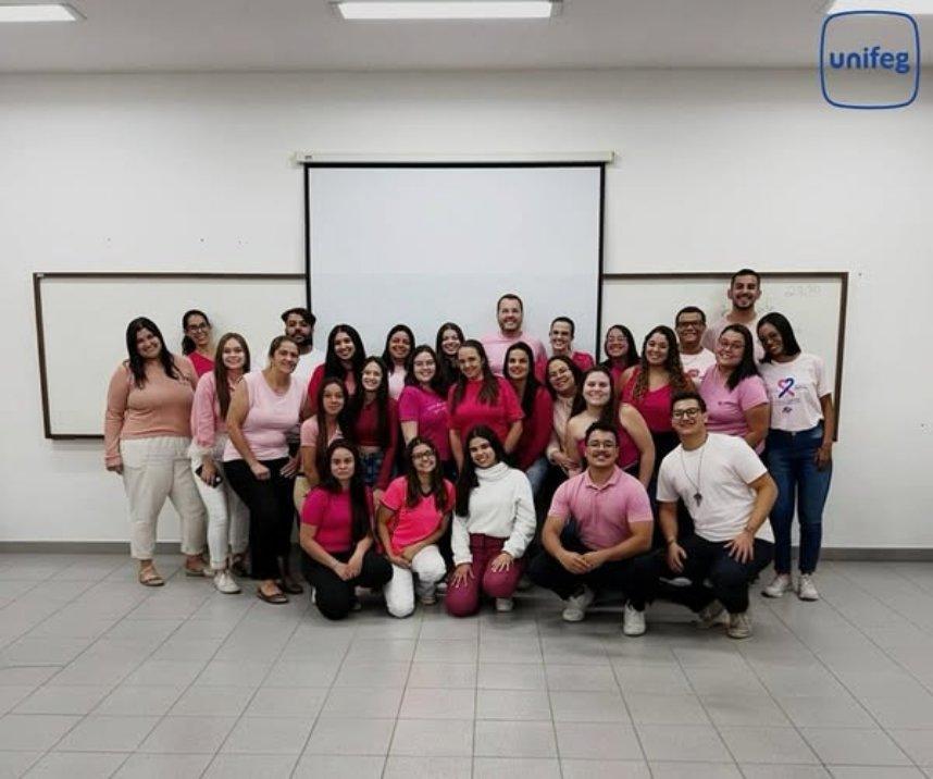 Nesta terça-feira, 21 de outubro, os alunos do curso de Fonoaudiologia participaram de uma ação especial em apoio à campanha Outubro Rosa. Vestidos com camisetas rosas, os estudantes reforçaram a importância da conscientização sobre a prevenção e o diagnóstico precoce do câncer de mama.