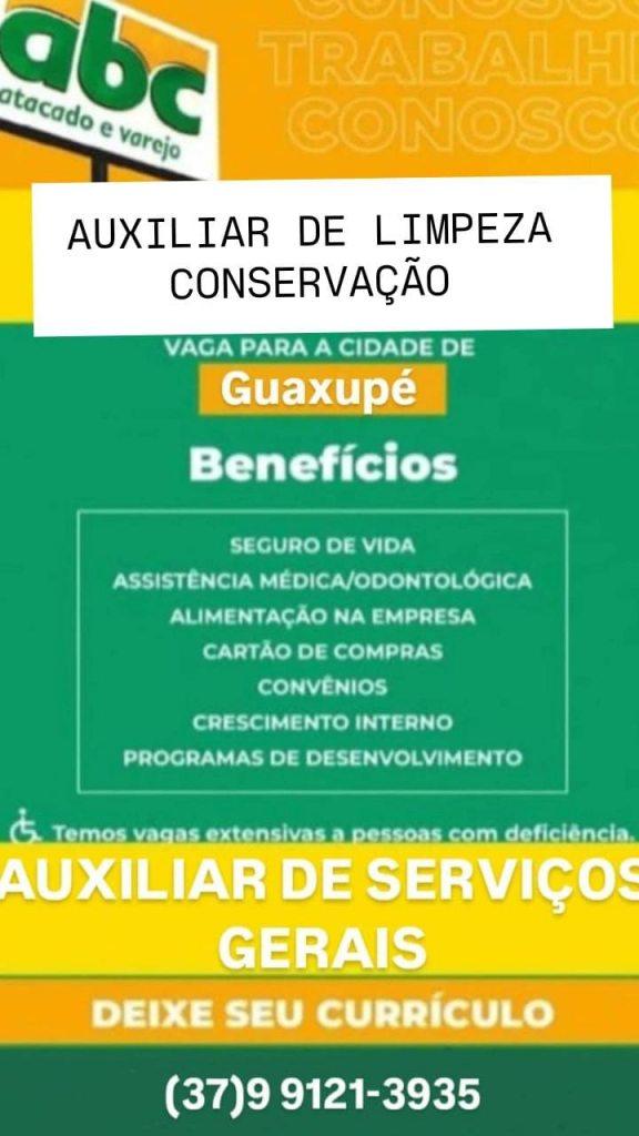 A rede ABC Atacado e Varejo anunciou a abertura de uma vaga para auxiliar de limpeza na cidade de Guaxupé (MG). A função é para o turno de fechamento e noturno, e os interessados devem entrar em contato pelo telefone (37) 9 9121-3935 para mais informações ou envio de currículo.