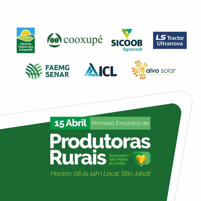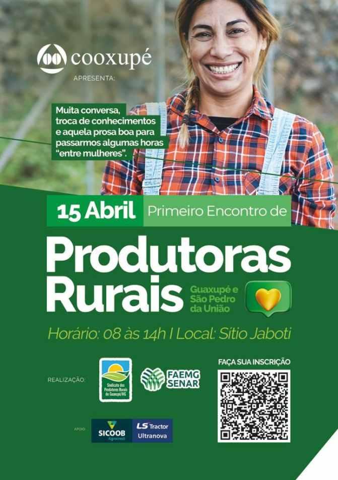 Mulheres atuantes na agricultura e a pecuária do Sul e Sudoeste mineiros participarão, neste sábado, 15 de abril, do "1º Encontro das Produtoras Rurais de Guaxupé e São Pedro da União". O evento, organizado pelo Sindicato dos Produtores Rurais de Guaxupé, em parceria com a Cooxupé, FAEMG/SENAR, entre outros, vai ao encontro da valorização da força, cada vez maior, da classe feminina dentro da vida no campo.
