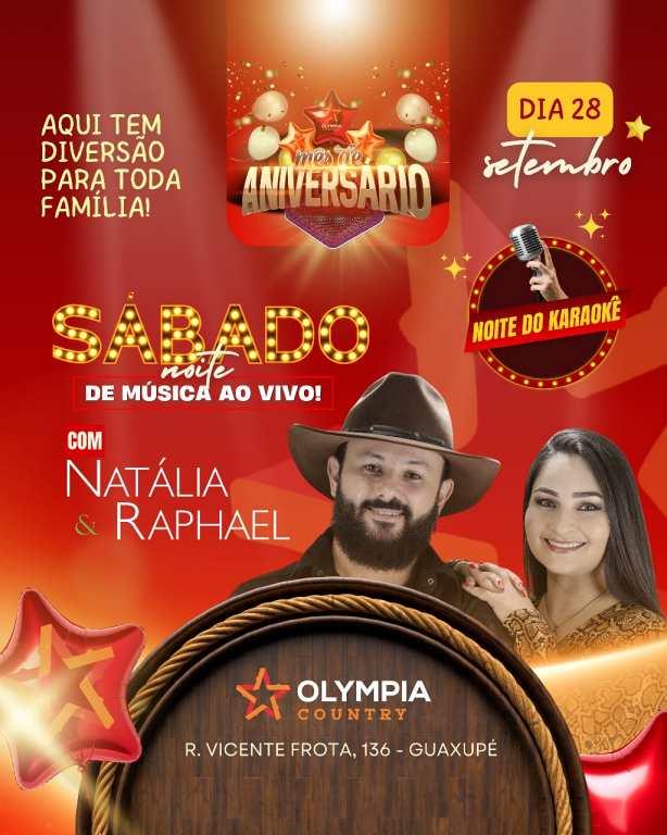 A dupla artística Natália & Raphael animará a noite deste sábado, 28 de setembro, no Olympia Contry, que fica na cidade de Guaxupé, pertencente ao Sudoeste mineiro (e comemora três anos de atividades plenas, com muito sucesso!). Apontado como um dos principais pontos de shows ao vivo da região, o local ofertará, ainda, completo serviço de bar, com restaurante e área para crianças (repleta de brinquedos eletrônicos e monitores capacitados). Para clientes que prefiram, o Olympia aceita reservas de mesas por meio do telefone (35) 3552-6947 ou o whatsapp de número 9-9213-0001. Estabelecido à Rua Vicente Frota, nº 136, no Jardim Angola, o estabelecimento também tem programação imperdível para esse domingo, 29 de setembro, com "Almoço Especial Turma da Mônica e Sansão". Informe-se já e desfrute de mais esse momento em família. #jornaljogoserio #olympiacountry #musicaaovivo #show #servicodebar #petiscos #sabadao #restaurante #areakids #almoco #domingao #turmadamonica #sansao #paratodos #familia #amigos #reservademesa #divertimento #alegria #quedelicia #guaxupe #sudoeste #suldeminas #minasgerais #brasil #jornalismodigital #alinedojornaljogoserio