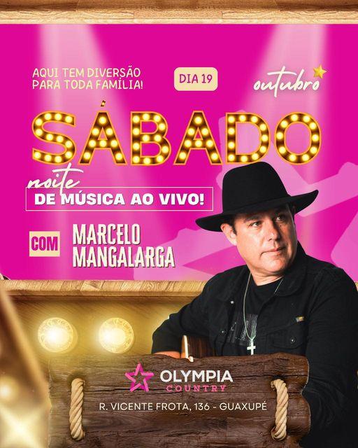 O músico Marcelo Mangalarga será a atração principal desta noite de sábado, 19 de outubro, no OLYMPIA COUNTRY, que fica na cidade de Guaxupé, no Sudoeste mineiro. Renomado, o intérprete deverá atrair público expressivo à referida casa de shows.