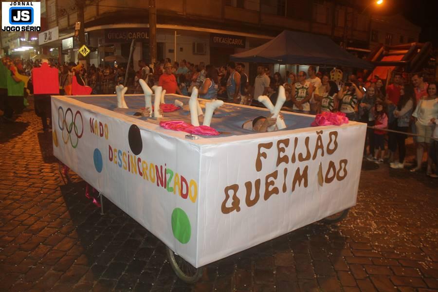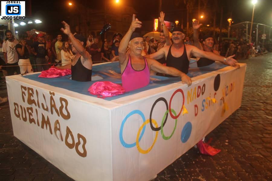 O Feijão Queimado acaba de desfilar no sambódromo do “Carnaval Guaxupé 2017 – cem anos de samba” (agora são 22h15 deste domingo, 26de fevereiro). Habitualmente autêntico, o bloco foi à Avenida Conde Ribeiro do Valle com atuações pitorescas, ao mesmo tempo em que encantou por conta do bom nível e a criatividade de sua apresentação. Com bateria afinada (conduzida por Guilherme Escarassati), alas coloridas e uma “piscina” alusiva aos jogos olímpicos, com equipe em plena performance, o grupo arrancou calorosos aplausos e gargalhadas do público presente. Tradicional na cidade, o “Feijão” relembrou os tempos de ouro do carnaval guaxupeano, quando seus componentes eram caracterizados por comemorarem a Festa de Momo com muita irreverência. – Antes do Feijão Queimado, a segunda noite de desfiles em Guaxupé contou com a exibição da Escola de Samba Fênix, a qual homenageou ao escritor Elias José e as quatro estações climáticas. Ainda hoje, a escola Portal de Minas passará pelo sambódromo, sendo que logo após, no palco principal, a Velha Guarda Show de Bateria Mangueira/RJ e do Batuque do Bem comandam os espetáculos culturais do carnaval. – ACESSE WWW.jornaljogoserio.com.br para saber como está a festança da Secretaria Municipal de Cultura, Esporte e Turismo de Guaxupé.
