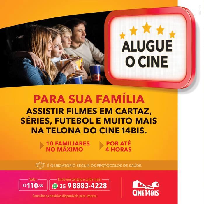 Para atender às mais diversas expectativas, ao alugar a sala do Cine 14Bis, o contratante poderá assistir a filmes que estiverem em cartaz, séries e filmes de diversas plataformas de streaming (da qual o cliente é assinante), jogos e muito mais. Todas as sessões deverão seguir os protocolos de segurança, com uso de máscara obrigatório. A locação da sala para sessão já está disponível para reservas pelo WhatsApp (35) 9 8883-4228.