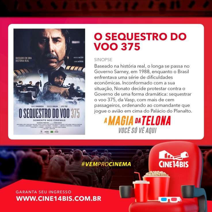 O Cine 14 Bis de Guaxupé, no Sudoeste mineiro, exibe, a partir desta quinta-feira, 14 de dezembro (até o próximo dia 20), o filme nacional "O sequestro do voo 375". Conforme a história de tragédias brasileiras, a videoprodução retrata o episódio real de 29 de setembro de 1988, quando o tratorista desempregado Raimundo Nonato tentou jogar uma aeronave, lotada, no Palácio do Planalto, com o objetivo de assassinar o então presidente, José Sarney.