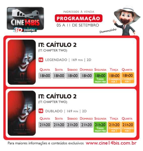 "It" consta de uma produção norte-americana, distribuído pela Warner Bros, com 169 minutos de duração, veiculação em 2D, com sessões disponíveis às 18h e 21h20, no Cine 14 Bis. Conforme a história, a cada 27 anos, o mal revisita a cidade de Derry, Maine. IT: A Coisa- Capitulo 2 traz os mesmos personagens – que há muito tempo seguiram seus próprios caminhos – de volta como adultos, quase três décadas depois dos eventos do primeiro filme.