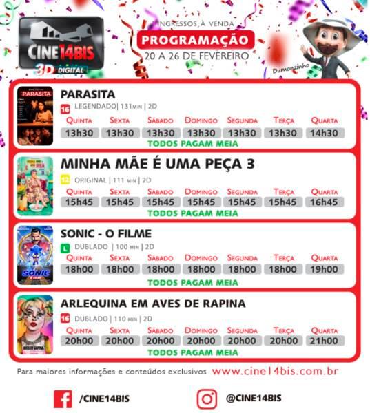 O longa "Parasita", com censura para público a partir de 16 anos, poderá ser visto nas sessões das 13h30; já "Minha mãe é uma peça 3" está disponível às 15h45 (e às 16h45 na quarta-feira); "Sonic - o filme" é a opção 18h (e 19h na quarta-feira); e "Arlequina em aves de rapina" passa na sessão das 20h (e às 21h na quarta-feira). CLIQUE para acessar o site do Cine 14 Bis.