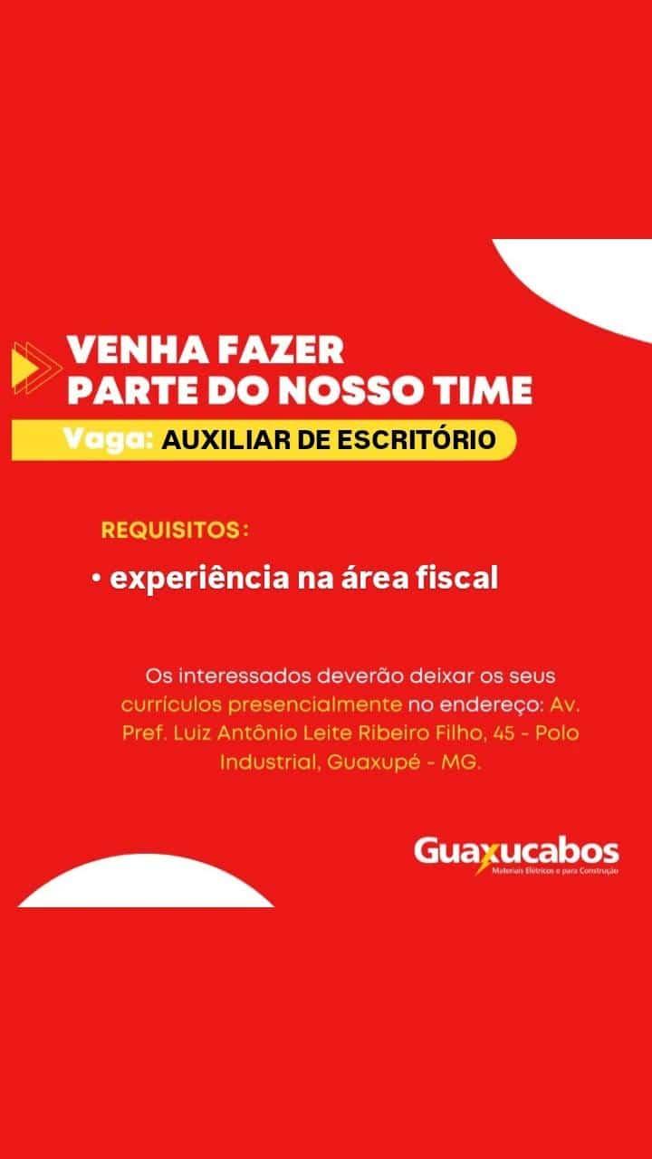 A Guaxucabos Materiais de Construção, em Guaxupé, no Sudoeste mineiro, oferta vaga de trabalho para a função de auxiliar de escritório. Dos requisitos, é necessário ter experiência na área fiscal. Interessados devem deixar seus currículos na empresa, que fica na Avenida Prefeitura Luiz Antônio Leite Ribeiro - Totonho, nº 45, no Pólo Industrial.
