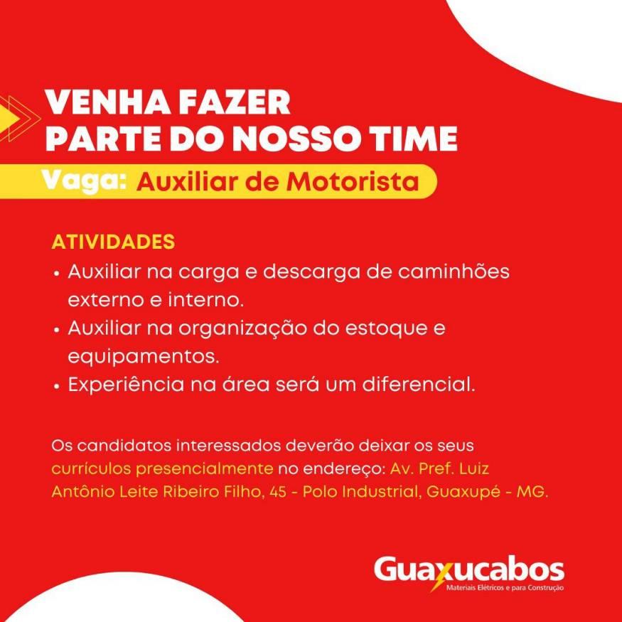 A Guaxucabos, especializada na venda de materiais para construção, sediada em Guaxupé, no Sudoeste mineiro, com atuação macrorregional, oferta uma oportunidades de emprego para interessados nas funções de motorista e auxiliar de motorista. Para a primeira condição é necessário possuir a Carteira Nacional de Habilitação nas categorias D ou E, assim como experiência na área, além de ter foco, ser proativo e organizado. Candidatos devem enviar seus currículos à loja, que fica na Avenida Prefeito Luiz Antônio Leite Ribeiro Filho - Totonho, nº 45, no Polo Industrial.