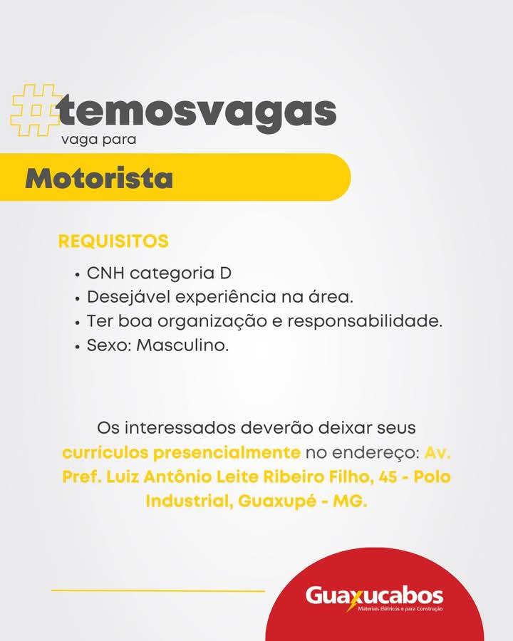 A Guaxucabos, especializada na venda de produtos elétricos, hidráulicos e de materiais para a construção civil, oferta vagas de emprego nas áreas de motorista (do sexo masculino) e auxiliar de limpeza (feminino). Dos requisitos para ambas as funções contam como diferenciais ter experiência na área, ser proativo e organizado. Para os motoristas, será necessário a Carteira Nacional de Habilitação na categoria D. Interessados devem levar seus currículos pessoalmente à firma, que fica na Avenida Prefeito Luiz Antônio Leite Ribeiro, nº 45, no Polo Industrial de Guaxupé.
