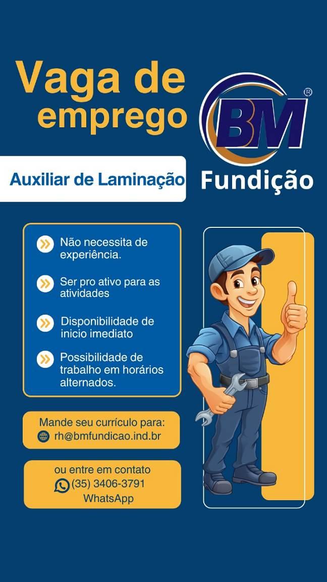 A BM Fundição, estabelecida no Polo da Moda, em Guaxupé, que fica no Sudoste mineiro, oferta vagas de trabalho nas áreas de: operador de empilhadeira (com experiência mínima de seis meses, curso profissional na área, disponibilidade imediata para iniciar o trabalho e flexibilidade de horários), auxiliar de laminação (ser proativo e ter disponibilidade para trabalhar em horários alternativos) e mecânico industrial (experiência mínima de seis meses no ramo e possibilidade de trabalhar em horários distintos). Os interessados devem enviar currículos para o email rh@bmfundicao.ind.br ou no whatsapp de número (35) 9-3406-3791. - CLIQUE AQUI e receba os conteúdos do JOGO SÉRIO em seu whatsapp. - NESSE LINK, você passa a seguir a nova fanpage/facebook Jornal JOGO SÉRIO. - A QUALQUER instante, acesse www.jornaljogoserio.com.br e fique muito bem informado.