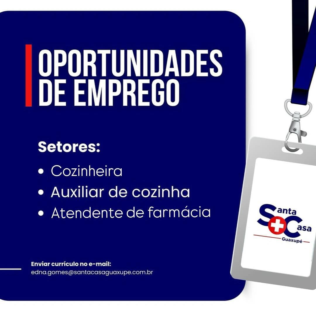 A Santa Casa de Guaxupé, no Sudoeste mineiro (que administra ainda o Pronto Socorro e o Centro de Hemodiálise), oferta vagas de emprego nas funções de cozinheira, auxiliar de cozinha e atendente de farmácia. Interessados devem enviar seus currículos ao email edna.gomes@santacasaguaxupe.com.br. - AJUDE O jornal que lhe informa a todos os momentos: faça um PIX de qualquer valor para 11.086.919/0001-66. - CLIQUE AQUI e receba os conteúdos do JOGO SÉRIO em seu whatsapp. - NESSE LINK, você passa a seguir a nova fanpage/facebook Jornal JOGO SÉRIO. - A QUALQUER instante, acesse www.jornaljogoserio.com.br e fique muito bem informado.