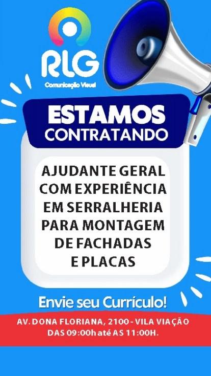 A RLG Comunicação Visual contrata: ajudante geral, com experiência em serralheria, para montagem de fachadas e placas. Interessados devem enviar seus currículos à firma, que fica na Avenida Dona Floriana, nº 2100, em Guaxupé, no Sudoeste mineiro (entre 9h e 11 horas). - AJUDE O jornal que lhe informa a todos os momentos: faça um PIX de qualquer valor para 11.086.919/0001-66. - CLIQUE AQUI e receba os conteúdos do JOGO SÉRIO em seu whatsapp. - NESSE LINK, você passa a seguir a nova fanpage/facebook Jornal JOGO SÉRIO. - A QUALQUER instante, acesse www.jornaljogoserio.com.br e fique muito bem informado.