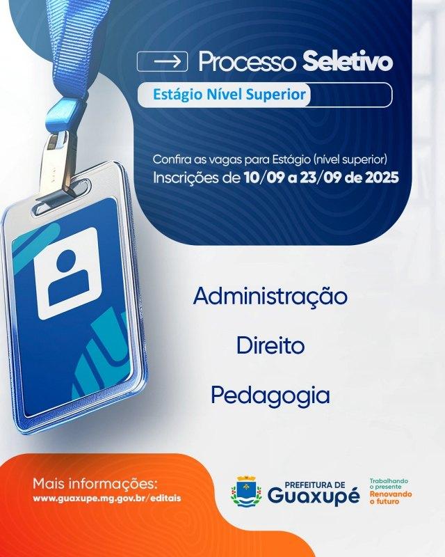 A Prefeitura de Guaxupé anunciou a abertura de um Processo Seletivo para Estágio de Nível Superior, oferecendo oportunidades para universitários que desejam vivenciar a prática profissional em setores da administração pública. As inscrições estarão abertas de 10 a 23 de setembro de 2025, contemplando vagas para estudantes dos cursos de Administração, Direito e Pedagogia. De acordo com o município, o estágio busca fortalecer a formação acadêmica dos alunos e contribuir para o desenvolvimento de serviços públicos de qualidade. Os interessados devem conferir todos os detalhes, requisitos e etapas do processo no edital completo, disponível neste link oficial. - AJUDE O jornal que lhe informa a todos os momentos: faça um PIX de qualquer valor para 11.086.919/0001-66. - CLIQUE AQUI e receba os conteúdos do JOGO SÉRIO em seu whatsapp. - NESSE LINK, você passa a seguir a nova fanpage/facebook Jornal JOGO SÉRIO. - A QUALQUER instante, acesse www.jornaljogoserio.com.br e fique muito bem informado.
