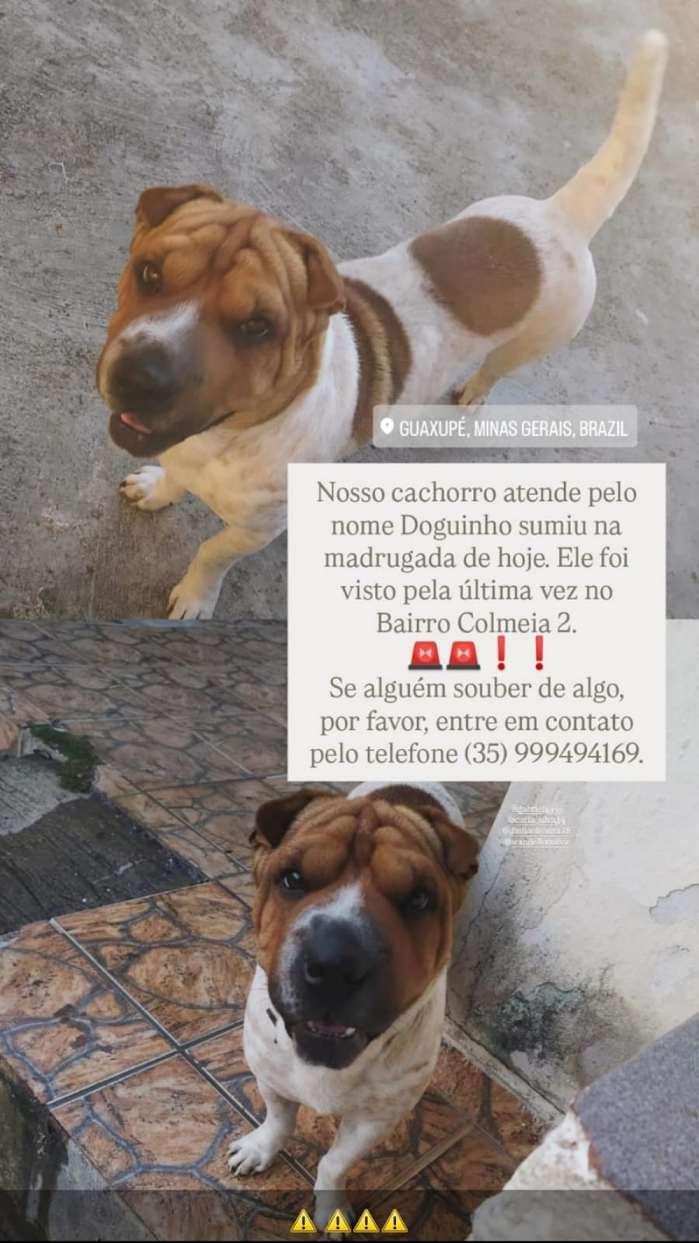 Uma família do Bairro Colmeia II, em Guaxupé, no Sudoeste mineiro, procura desesperadamente pelo paradeiro de seu cãozinho de estimação. De porte médio, com a pelagem nas cores branca e caramelo, o animalzinho atende pelo nome de "Doguinho" e precisa retornar para casa o mais rápido possível. Informações devem ser transmitida a um dos dois números de telefone à frente: (35) 9-9949-4169 ou 9-9832-5028. - AJUDE O jornal que lhe informa a todos os momentos: faça um PIX de qualquer valor para 11.086.919/0001-66. - CLIQUE AQUI e receba os conteúdos do JOGO SÉRIO em seu whatsapp. - NESSE LINK, você passa a seguir a nova fanpage/facebook Jornal JOGO SÉRIO. - A QUALQUER instante, acesse www.jornaljogoserio.com.br e fique muito bem informado.