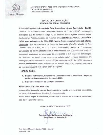 A direção da Casa de Acolhida e Apoio Dom Inácio, de Guaxupé, no Sudoeste mineiro, divulga edital de convocação relativamente à escolha da nova diretoria executiva, além de prestação de contas sobre balanço patrimonial e outros temas. O encontro oficial será presencial e ocorrerá no próximo dia 22 de abril, a partir das 18h30, na sede da entidade, que fica na Rua Coronel Joaquim Costa, nº 323, na área central da cidade. Dedicada ao cuidado de crianças em situação de vulnerabilidade social, durante período integral, no formato contraturno, a instituição conta com quarenta e cinco associados. Veja, na parte de fotos desta matéria, a íntegra deste Edital.