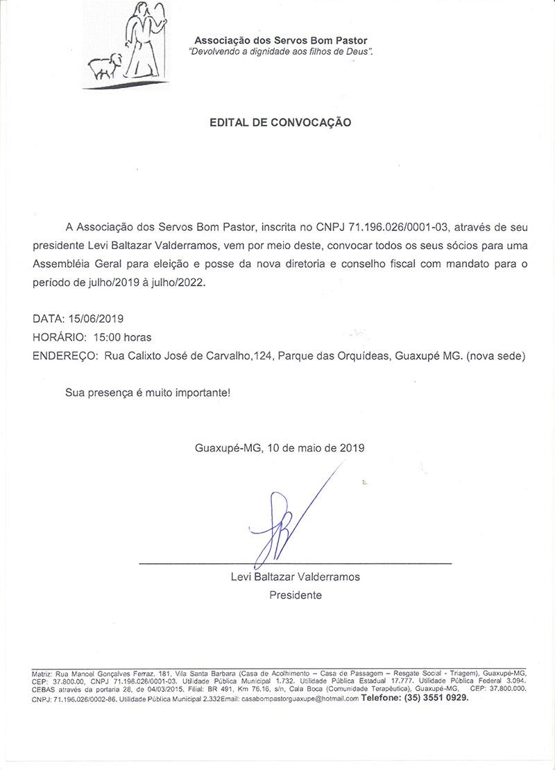 A Associação Servos do Bom Pastor divulga, nesta matéria, edital de convocação para assembleia geral de eleição e posse da nova diretoria e o conselho fiscal, para o mandato 2019/22. O evento está programado para às 15h deste dia 15 de junho de 2019, na rua Calixto José de Carvalho, nº 124, que fica no Parqeu das Orquídeas, em Guaxupé (nova sede). Veja o Edital e informe-se sobre mais esta etapa da instituição, que está entre as mais sérias da cidade e região, no que diz respeito à prestação de serviço socio-humanitário.