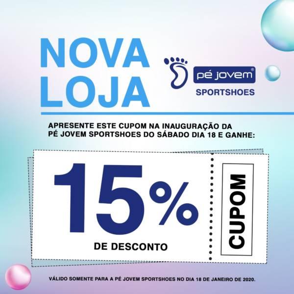 Clientes da Pé Jovem Calçados ganharão 15% de desconto nas compras efetuadas na loja SporShoes, que será inaugurada neste sábado, 18 de janeiro, às 10h, na Rua Pereira do Nascimento, nº 90, na área central da cidade. O cupom, disponível na parte de fotos desta matéria, deverá ser apresentado no próprio smartphone do consumidor, o que torna ainda mais fácil a conquista da super oferta da Pé Jovem.