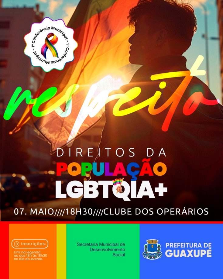 A conferência é organizada pelo Movimento LGBT guaxupeano, com o apoio da Secretaria Municipal de Desenvolvimento Social. "Vamos juntos construir políticas públicas mais justas, inclusivas e representativas para a população LGBTQIA+ de Guaxupé! Este é um espaço de escuta, diálogo e transformação, e a sua presença faz toda a diferença!", convidam os responsáveis pela iniciativa, os quais divulgam, nesse conteúdo, o link para as inscrições dos interessados: https://docs.google.com/forms/d/e/1FAIpQLSe4MwcwCBa6L11ou_a1LQYavI8jB-n48uoToS3niKCbiOV4aA/viewform?usp=preview - AJUDE O jornal que lhe informa a todos os momentos: faça um PIX de qualquer valor para 11.086.919/0001-66. - CLIQUE AQUI e receba os conteúdos do JOGO SÉRIO em seu whatsapp. - NESSE LINK, você passa a seguir a nova fanpage/facebook Jornal JOGO SÉRIO. - A QUALQUER instante, acesse www.jornaljogoserio.com.br e fique muito bem informado.