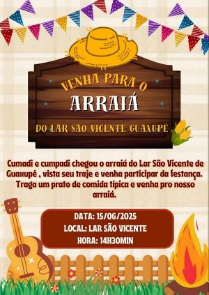 O clima de festa junina já está no ar em Guaxupé! No próximo dia 15 de junho de 2025, o Lar São Vicente realiza o seu tradicional Arraiá, prometendo muita alegria, comidas típicas e celebração para toda a comunidade. O evento terá início às 14h30 e será realizado na sede do Lar São Vicente.