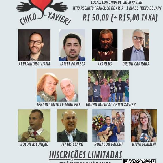 O “14º Encontro Chico Xavier” será realizado nestes dias 26 e 27 de julho, na Comunidade Espírita Chico Xavier, que fica no Sítio Recanto, a um quilômetro após o Trevo do Japy, em Guaxupé, no Sudoeste mineiro. Promovido para divulgar a doutrina codificada por Allan Kardec, conforme as lições de Jesus Cristo, o evento será composto por palestras, exibições artísticas, confraternização e muitas atividades ligadas à religião que lida com a imortalidade, a caridade e o amor ao próximo.