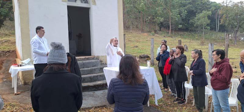 Devotos participam de missa na Capela de São Miguel Arcanjo, em Guaxupé