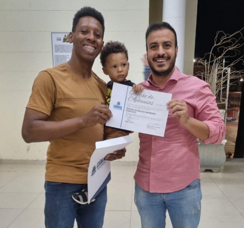 O artista guaxupeano Riuler Reinaldo Moreira Narciso foi agraciado, nessa semana, com uma “Moção de Aplauso”, ofertada pelo vereador Pedro Luiz Alves, de Guaxupé, no Sudoeste mineiro. Dono de incomparável talento (para o hip-hop, teatro, música, entre outras manifestações culturais), o homenageado recebeu a condecoração em vitude de suas participações (como palestrante da temática Política e Cultura) em plenárias do Parlamento Jovem da cidade, assim como na região (Arceburgo, Monte Belo, Bom Jesus da Penha, Nova Resende, Muzambinho, Monte Santo, Tapiratiba, Cabo Verde) e também em Belo Horizonte. A moção foi entregue nesta segunda-feira, 18 de agosto, após a 26ª Sessão da Câmara Municipal. Responsável por estruturar a Escola do Legislativo em Guaxupé, Pedro Alves indicou Riuler para palestras e exibições artísticas (ele pertence ao Família de Rua Crew) em etapas regionais do Parlamento Jovem, no primeiro semestre. “Sua contribuição foi muito importante e demonstro minha gratidão com essa Moção”, disse o vereador. “Não há palavras para agradecer, pois desde que me convidaram para a plenária de Guaxupé, as portas abriram-se e participei em várias cidades”, retribuiu Riuler, que ocupa o cargo de vice-presidente do Conselho Municipal de Cultura em Guaxupé.