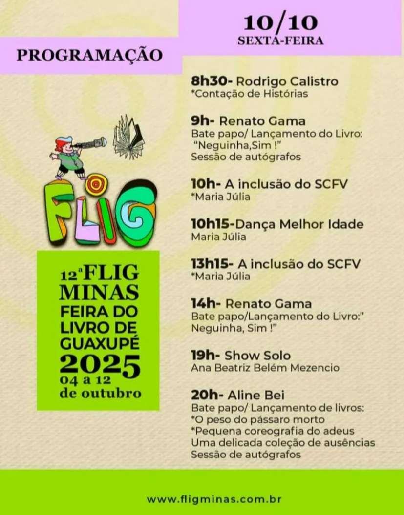 A 12ª edição da FLIG Minas – Feira do Livro de Guaxupé, que começou no último dia 4 de outubro, chega à reta final com uma programação intensa nesta sexta-feira (10). O evento, realizado na Praça da Mogiana, continua reunindo escritores, artistas e o público em torno da literatura, da cultura e da inclusão.