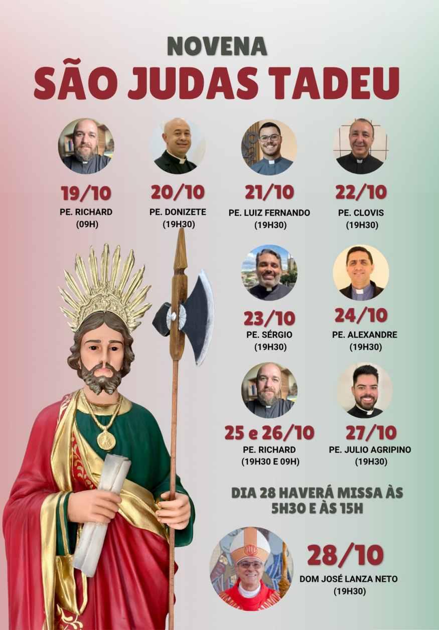 Durante nove dias, os fiéis participarão de celebrações especiais, conduzidas por diversos padres convidados. A programação religiosa terá início neste sábado, 19/10, com missa celebrada pelo Padre Richard, às 9h. Ao longo da novena, as celebrações serão presididas pelos padres Donizete, Luiz Fernando, Clovis, Sérgio, Alexandre, Júlio Agripino e novamente Richard, encerrando com a missa solene presidida por Dom José Lanza Neto, no dia 28/10, às 19h30. Neste dia, também haverá missas às 5h30 e 15h.