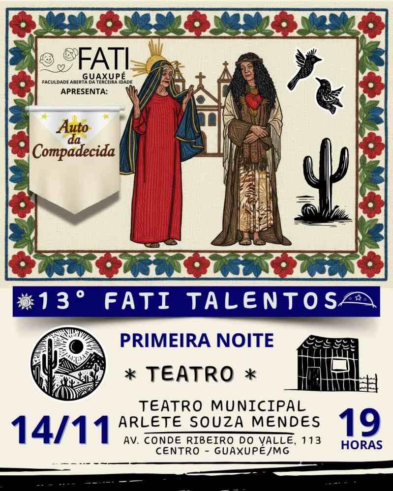 O "FATI Talentos 2025" será realizado em dois momentos este ano, com apresentações culturais programadas para acontecerem nos dias 14 e 15 de novembro, no Teatro Municipal Arlete Souza Mendes, em Guaxupé, na região Sudoeste mineira. Resultado de atividades desenvolvidas durante o ano, as exibições encerrarão mais uma temporada de sucesso da Faculdade Aberta da Terceira Idade, mantido pelo Centro Universitário da Fundação Educacional Guaxupé, via Associação Renascer.