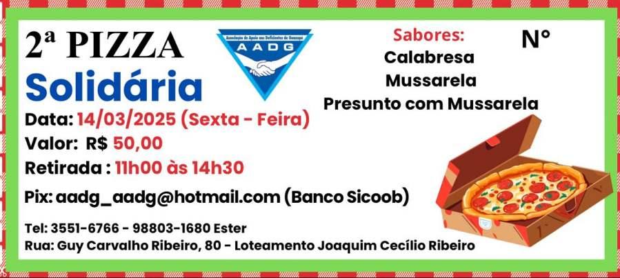 A Associação de Apoio aos Deficientes de Guaxupé, no Sudoeste mineiro, iniciou, por esses dias, sua “2ª Pizza Solidária”, em mais uma ação voltada à captação de recursos para custear as despesas da entidade. Com opções em calabresa, muçarela ou presunto com muçarela, os produtos custam R$ 50,00 e devem ser solicitados via telefone whatsapp de número (35) 9-8803-1680 (com Ester) ou (35) 3551-6766 (pague com PIX: aadg_aadg@hotmail.com). De acordo com os trabalhadores, a retirada será no próximo dia 14 de março, das 11h às 14h30, na sede da AADG, situada à Rua Guy Carvalho Ribeiro, nº 80, no Bairro Joaquim Cecílio Ribeiro (próximo ao Fórum).