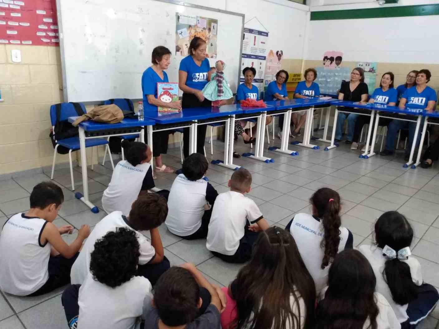 Frequentadores da Faculdade Aberta da Terceira Idade - Unifeg participaram, nesta manhã de segunda-feira, 22 de setembro, de uma roda de conversas, com contação de histórias, na Escola Caic, em Guaxupé, que fica na região Sudoeste mineira. Conduzidos pela professora mestra, Elisabete Brockelmann de Faria, os visitantes interagiram com crianças do Ensino Fundamental I da Escola Municipal Professor José de Sá (que encontra-se momentaneamente no Caic, haja vista a reforma de sua sede, no Jardim Novo Horizonte).