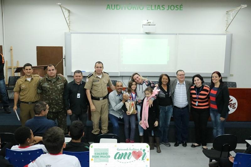 Num dos mais empolgantes momentos da formatura, os presentes conheceram os vencedores do concurso de redação, que foi aplicado em sala de aula, pelo cabo Franco, tendo os estudantes relatado sua experiência com o Proerd. Entre os participantes, a aluna Beatriz Fernandes Pina Gomes Silva foi a campeã, enquanto seus colegas, Maria Júlia Gonçalves de Oliveira e Rafael Augusto Luz Souza ficaram, nesta ordem, em 2ª e 3º lugares. "Eu nem acreditei quando ouvi meu nome! Foi uma alegria só! Agradeço muito ao cabo Franco, com quem tanto aprendi. E também aos meus professores do Dom Inácio, pois se fiz esta redação é porque me ensinam muito bem", ressaltou Beatriz, evidentemente feliz (ela ganhou um tablet e medalha, Maria Júlia e Rafael faturaram R$ 50,00, cada, além de jogos didáticos, ofertados pela Acig e a Galeria dos Presentes.