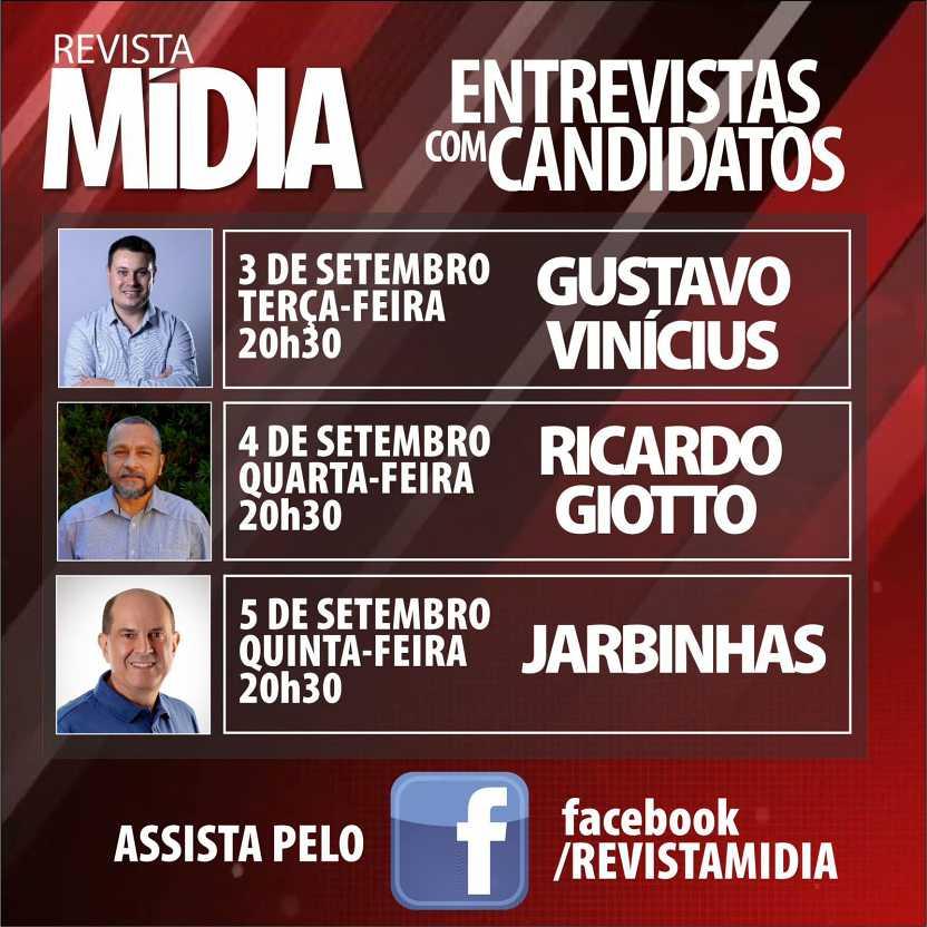 As entrevistas foram agendadas mediante as disponibilidades dos candidatos: Gustavo Vinícius - hoje, dia 3 de setembro, terça-feira, às 20h30; Ricardo Giotto: dia 4, quarta, às 20h30; Jarbinhas: Dia 5, quinta, às 20h30. - Onde Assistir: As entrevistas serão transmitidas ao vivo e podem ser acompanhadas pelos seguintes canais: Portal Mídia, Facebook, Instagram, YouTube, Whatsapp.