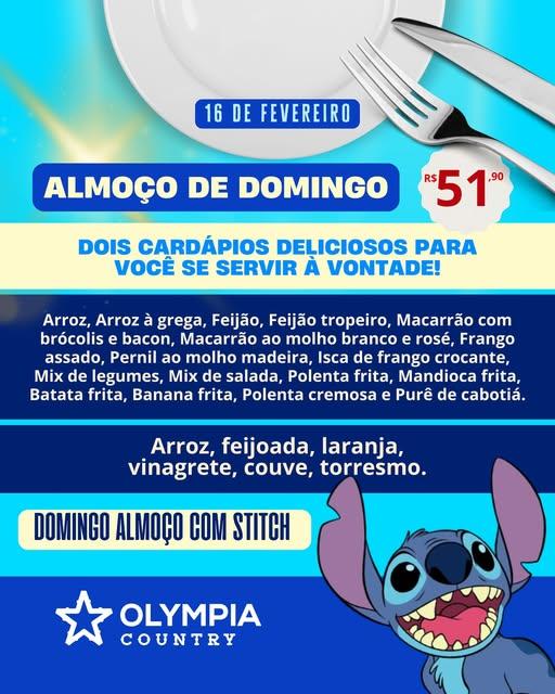 O Olympia Country receberá as famílias, em geral, neste domingo, 16 de fevereiro, para um super almoço, na companhia do "Stitch", um dos mais badalados personagens infantis da atualidade. Repleto de opções em lazer, congraçamento, diversão e gastronomia, o estabelecimento já está preparado para ofertar o que há de melhor em termos de culinária, ambiente agradável, com bem-estar, segurança e muita comodidade. Situado à Rua Vicente Frota, nº 136, no Jardim Angola, em Guaxupé, o Olympia aceita, ainda, reservas de mesas por meio do telefone whatsapp de número (35) 9-9213-0001.
