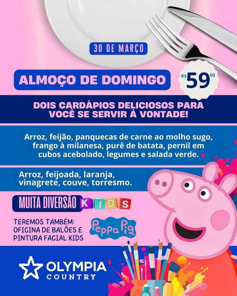 O Olympia Country, em Guaxupé, no Sudoeste mineiro, já encontra-se disponível para o almoço especial deste domingo, 30 de março. Com dois cardápios maravilhosos, o estabelecimento reserva, ainda, a participação da "Peppa Pig" para divertir as crianças; além do parque de diversões com brinquedos eletrônicos e muito mais. Situado à Rua Vicente Frota, nº 136, no Jardim Angola, o Olympia aceita reservas de mesas pelo telefone (35) 9-9213-0001.