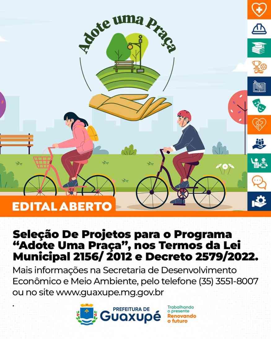 A Prefeitura de Guaxupé abriu o edital do programa Adote uma Praça, iniciativa que convida empresas locais a contribuírem com a manutenção e a revitalização de praças e outros espaços públicos da cidade. O objetivo é unir o poder público e o setor privado para transformar áreas urbanas, garantindo ambientes mais agradáveis e bem cuidados para a população. - Veja a publicidade da Cooxupé e continue a leitura em seguida.