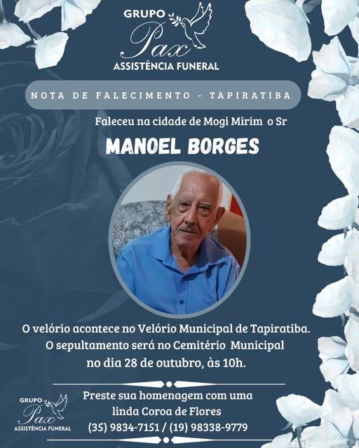 A Funerária PAX Guaxupé informa o falecimento de Manoel Borges, ocorrido em Mogi Mirim, no interior paulista, nesta segunda-feira, 27 de outubro. As últimas homenagens de corpo presente estão sendo prestadas no Velório Municipal de Tapiratiba, com o sepultamento programado para às 10 horas desta terça, 28, no Cemitério Municipal de Tapiratiba, com a presença de parentes e amigos. - AJUDE O jornal que lhe informa a todos os momentos: faça um PIX de qualquer valor para 11.086.919/0001-66. - CLIQUE AQUI e receba os conteúdos do JOGO SÉRIO em seu whatsapp. - NESSE LINK, você passa a seguir a nova fanpage/facebook Jornal JOGO SÉRIO. - A QUALQUER instante, acesse www.jornaljogoserio.com.br e fique muito bem informado.